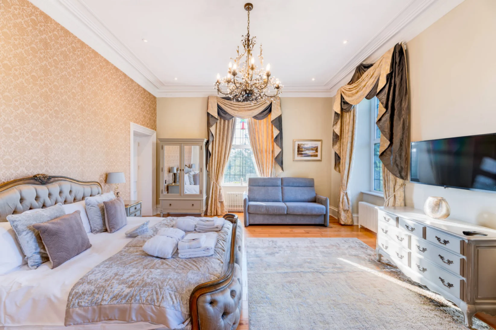 Bedroom 1 - 1 x Super King Sized Bed, 1 x Sofa Bed (sleeps 3) with ensuite (freestanding bath, 2 x basins, WC + steam room shower with TV)