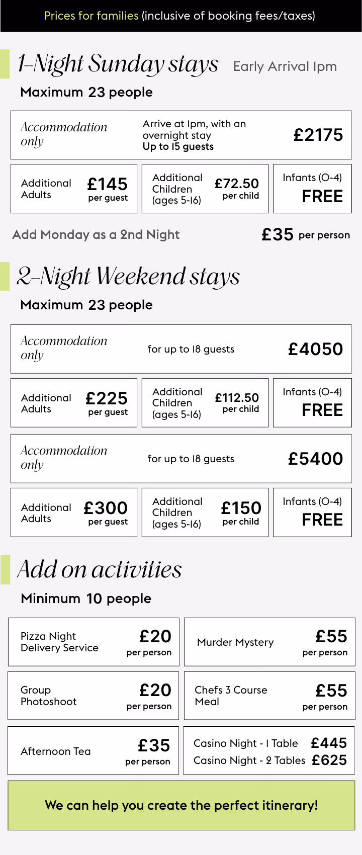 Share your thoughts, and we’ll refine everything until it feels just right - including bespoke activity combinations and updated quotes.