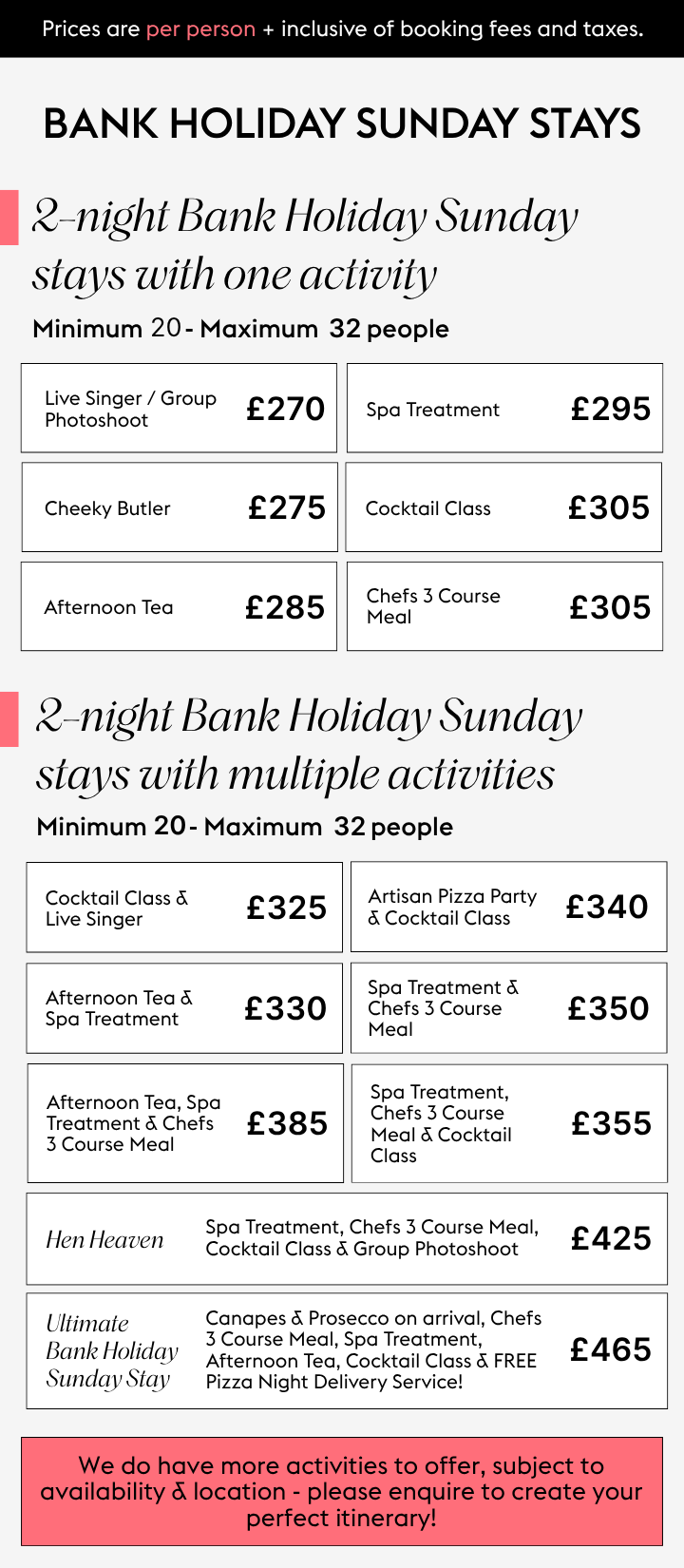 Your Sales & Celebration Consultant will come back to you with approx. 3 tailored property options with recommended activities that suit your group and celebration style.