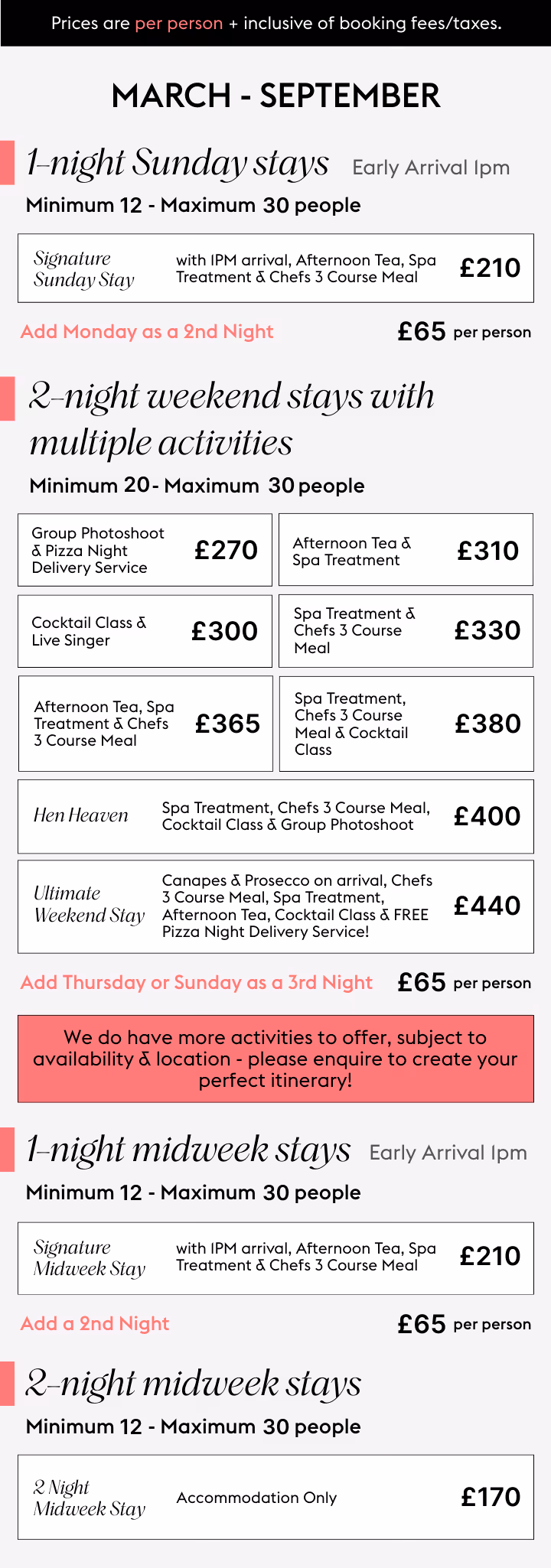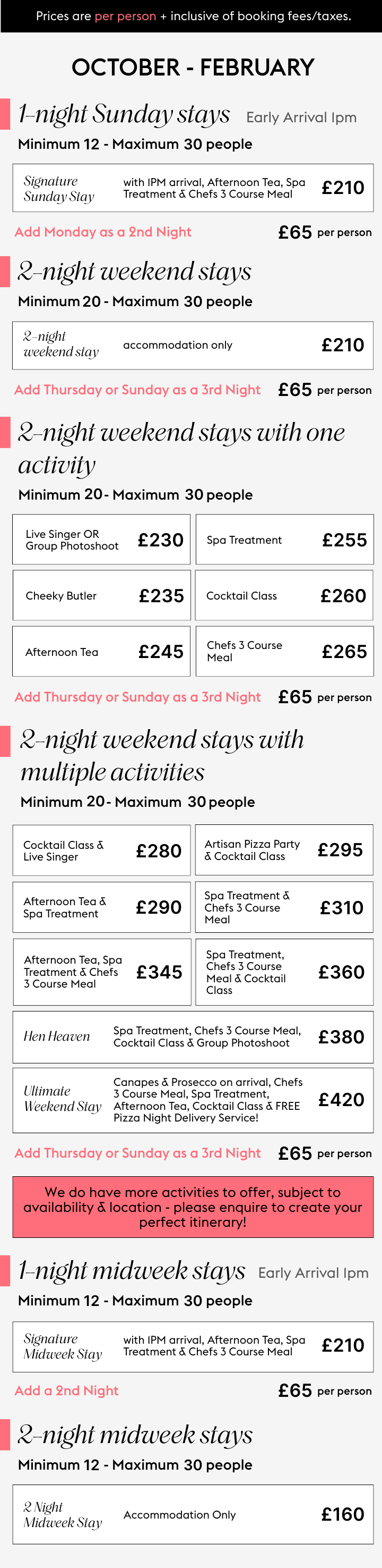Your Sales & Celebration Consultant will come back to you with approx. 3 tailored property options with recommended activities that suit your group and celebration style.