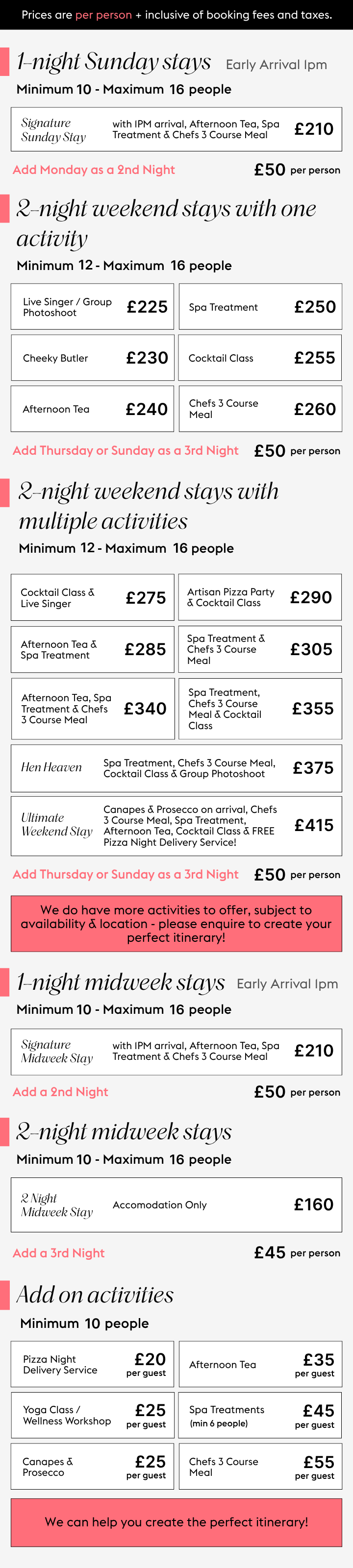 Your Sales & Celebration Consultant will come back to you with approx. 3 tailored property options with recommended activities that suit your group and celebration style.