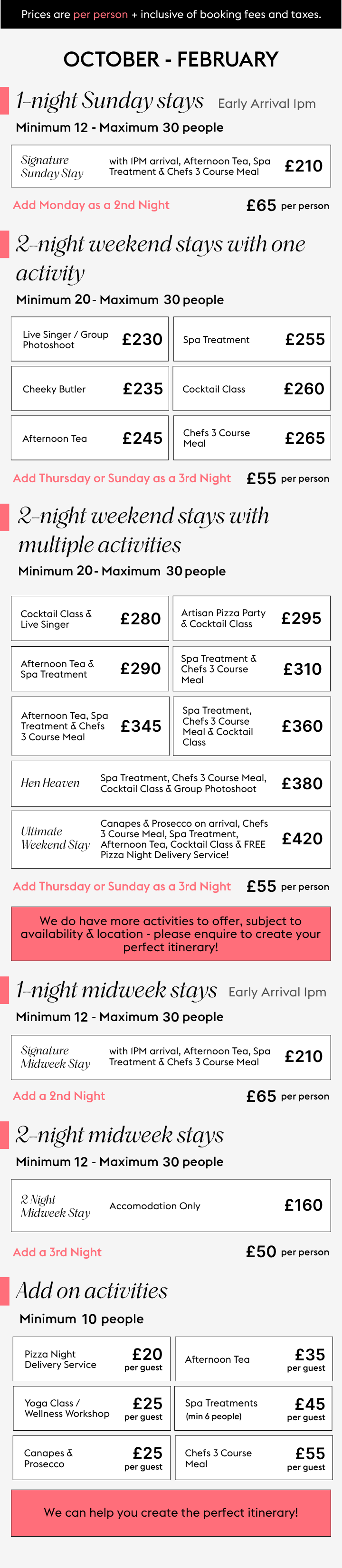 Your Sales & Celebration Consultant will come back to you with approx. 3 tailored property options with recommended activities that suit your group and celebration style.