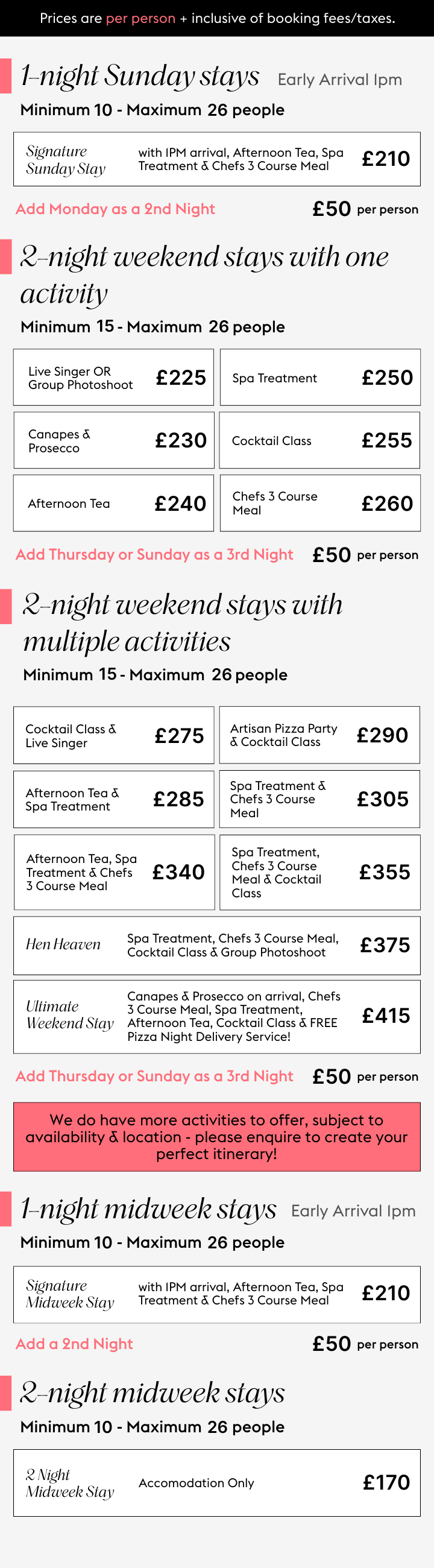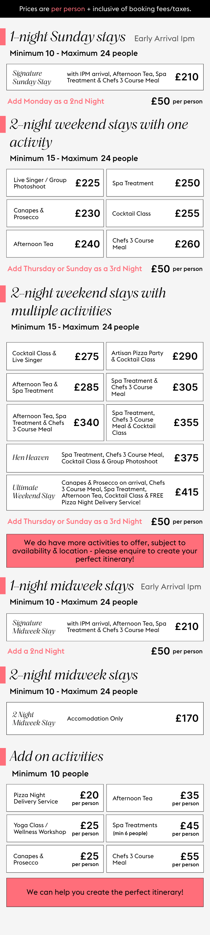 Your Sales & Celebration Consultant will come back to you with approx. 3 tailored property options with recommended activities that suit your group and celebration style.
