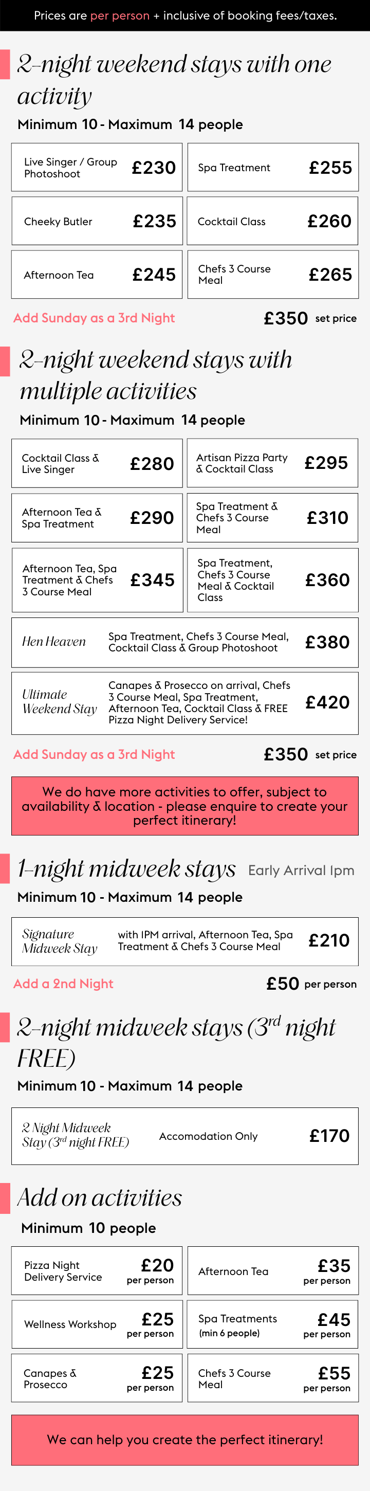 Your Sales & Celebration Consultant will come back to you with approx. 3 tailored property options with recommended activities that suit your group and celebration style.