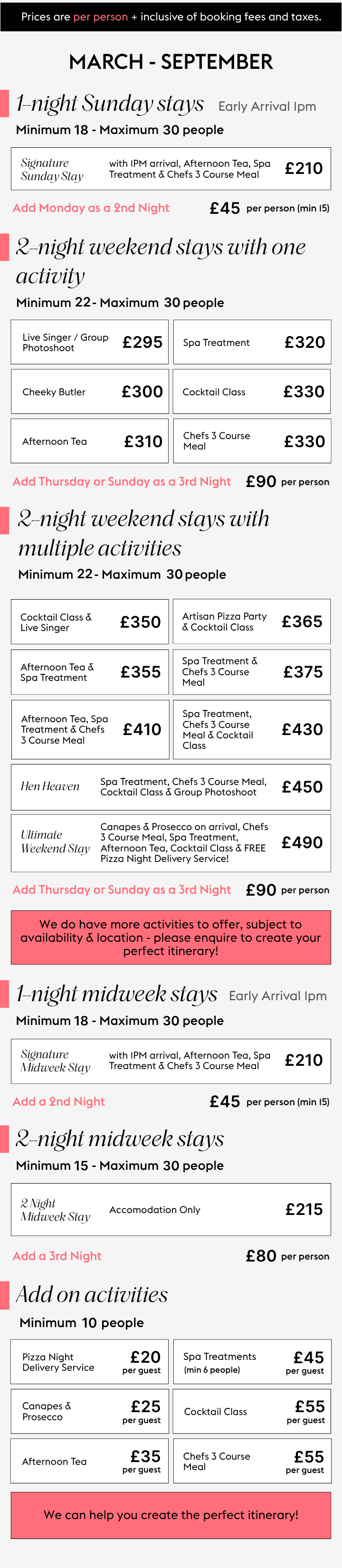 Your Sales & Celebration Consultant will come back to you with approx. 3 tailored property options with recommended activities that suit your group and celebration style.