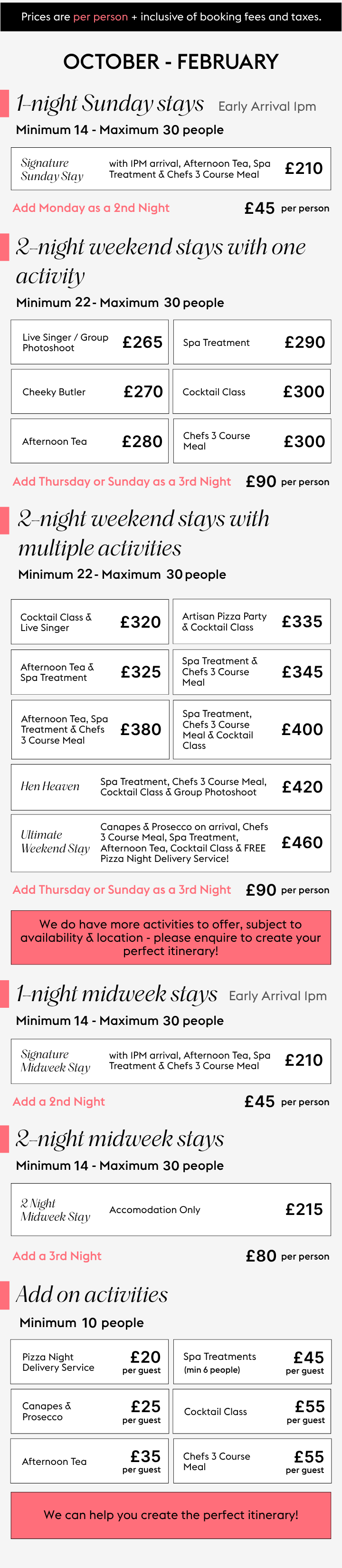 We had the most amazing weekend thank you. My sister loved it from start to finish, it was the perfect place for her hen do!