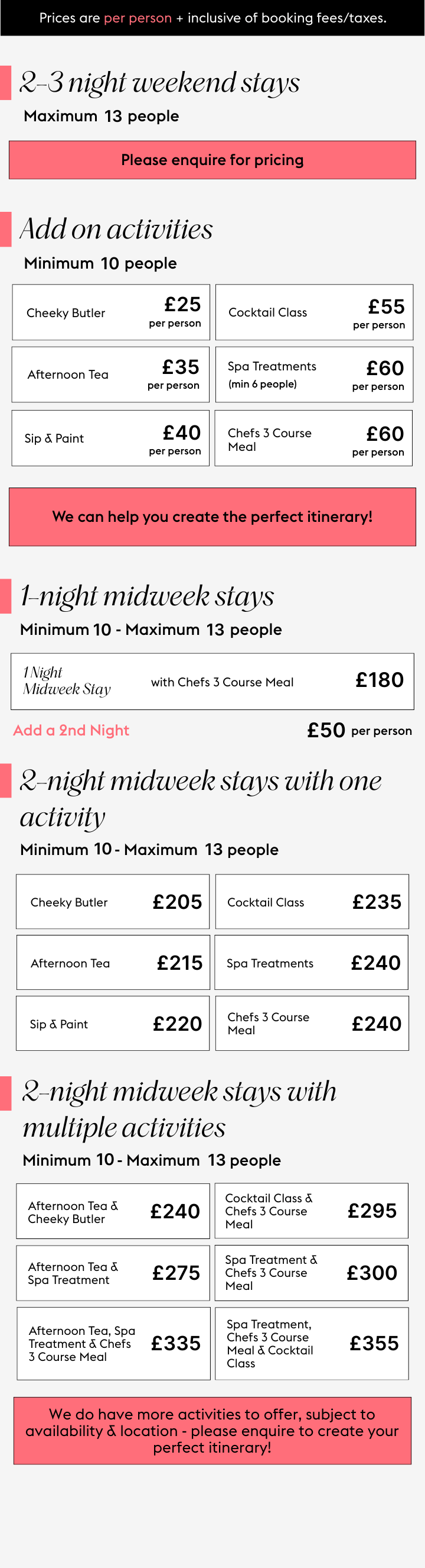 Your Sales & Celebration Consultant will come back to you with approx. 3 tailored property options with recommended activities that suit your group and celebration style.