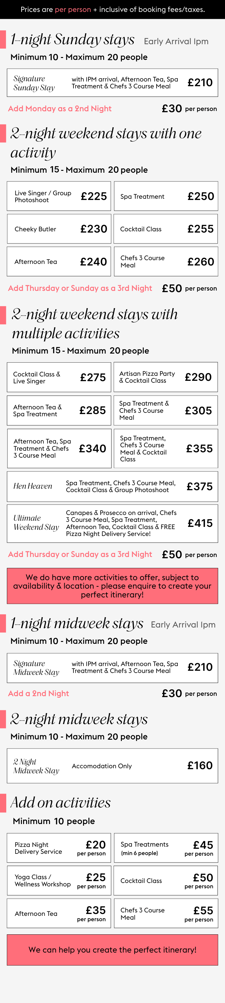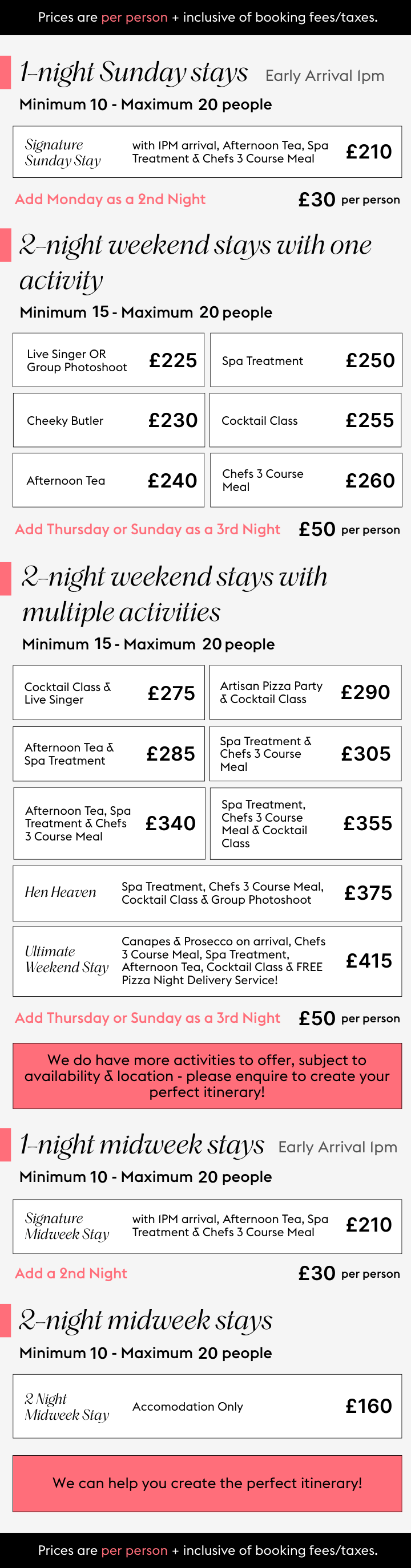 Your Sales & Celebration Consultant will come back to you with approx. 3 tailored property options with recommended activities that suit your group and celebration style.